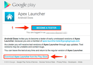 - The last step is to go to the Play Store and download the stable Apex Launcher, and beta updates will be automatically pushed to you since you have logged into the tester program with the same Google account.